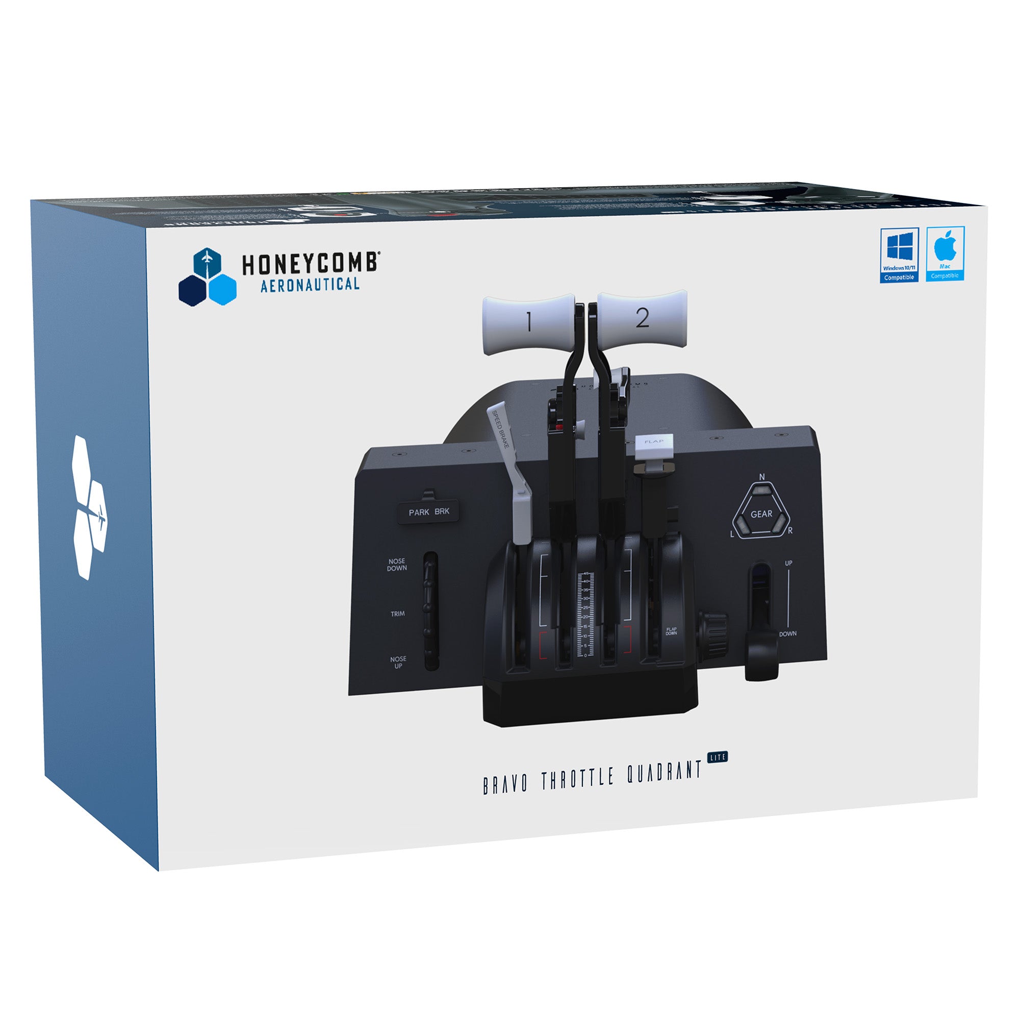 The Honeycomb Bravo Throttle Quadrant is an all-in-one cockpit system featuring a configurable throttle setup, from single-engine general aviation to four-engine commercial aircraft. It features multiple cockpit components including autopilot, annunciator panel, gear & flaps lever as well as a trim wheel.